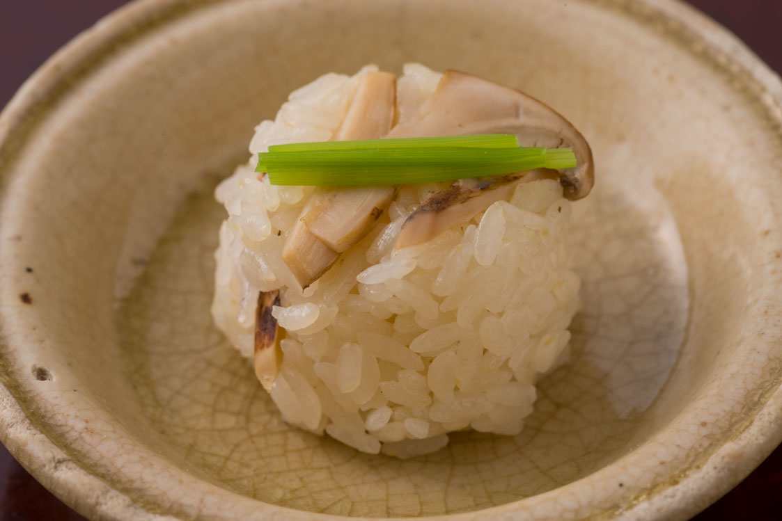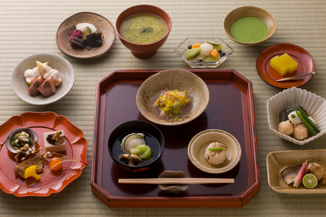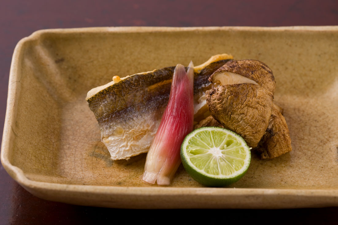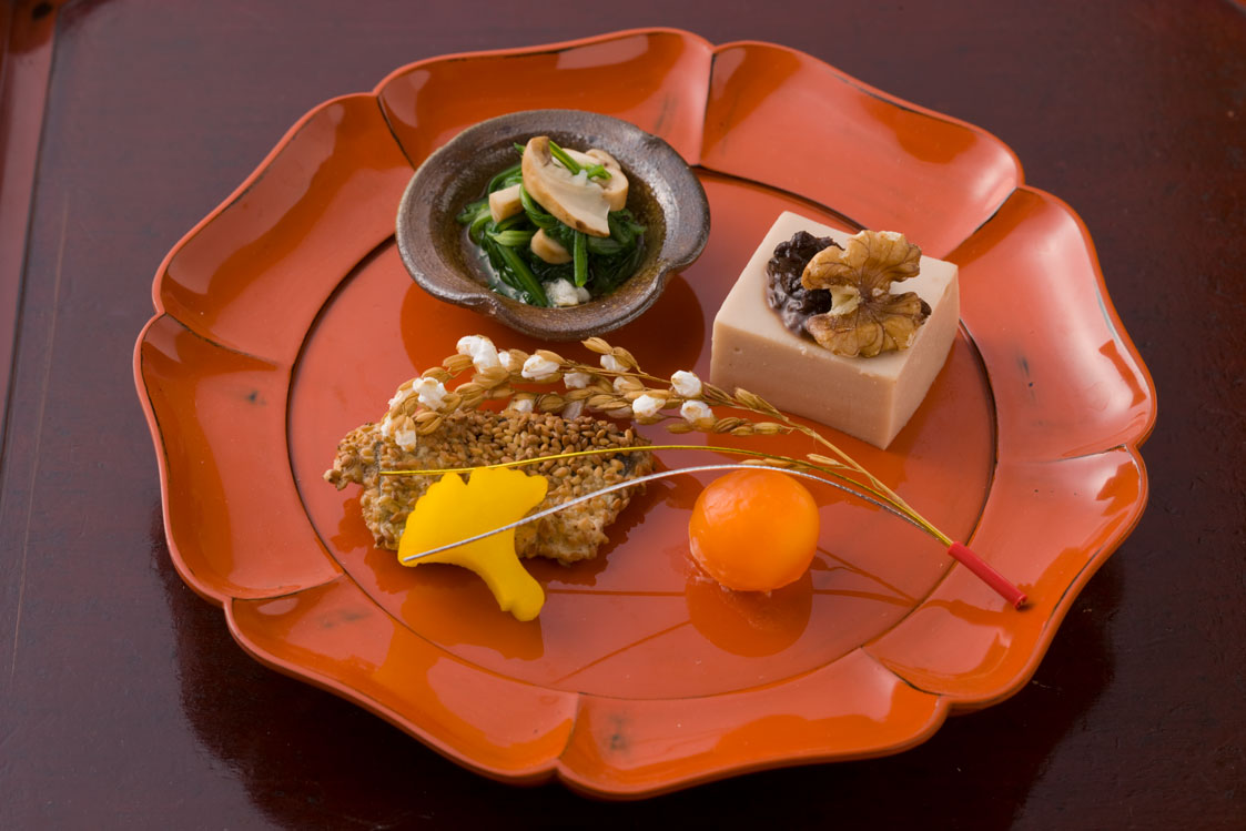 | 焼物 | 鮎一夜干し うるか 新生姜酢漬け 茗荷酢漬け 蓼酢 | 鉢肴 | 冬瓜 大和丸茄子 白木耳 海老そぼろ 湯葉餡 山葵 振り柚子 |